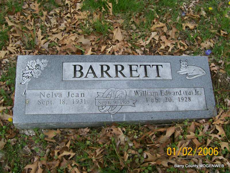 | BARRETT, William Edward "Ed", Jr. | Feb. 20, 1928 | No Date | SSW: Nelva Jean - Inscription: "Married Sept. 9, 1955" - Research Note: Son of William Edward and Mable Barrett. William Edward Barrett, Jr. first married Roberta Marion Boyer on Oct. 9, 1950 in Rock Hill, St. Louis Co., MO. Roberta was born Dec. 16, 1930. He second married Nelva Jean (Martin) Iskevor on Feb. 20, 1928 in St. Louis, St. Louis Co., MO. - 1930 Census, Rock Hill, St Louis, Missouri - W. Edward Barrett, age 32; Mable, wife, age 23; Edward, son, age 2. - 1940 Census, Rock Hill, St Louis, Missouri - William R. Barrett, head, age 72; Nellie J., wife, age 68; Edward W., son, age 42, divorced; Edward W., age 13, grandson. | MO Marriage Records Census Phyllis Long Photo Jay Trace |