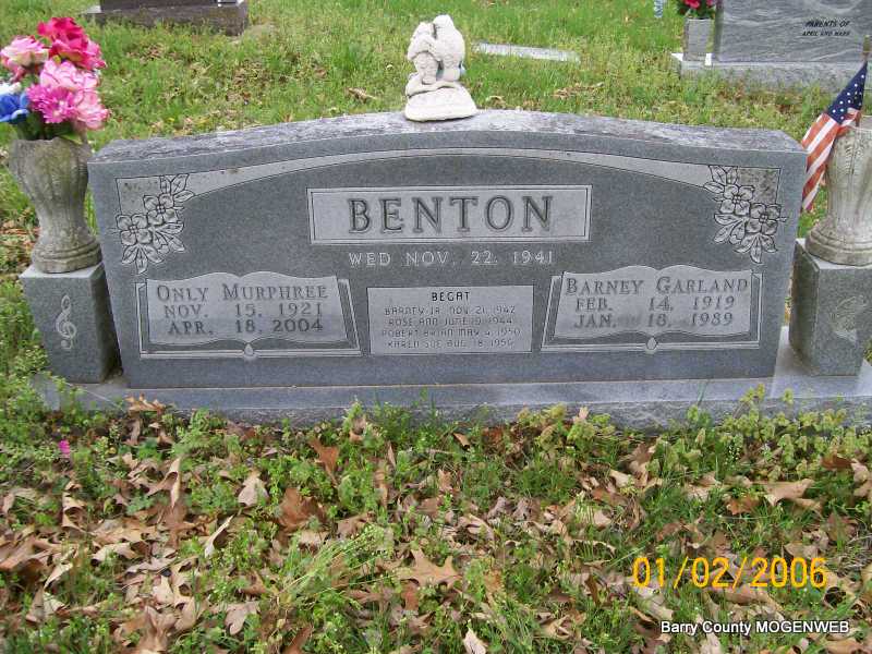 SSW: Barney Garland - Inscription: "Wed. Nov. 22, 1941" - Research Note: Carroll County News Weekend Edition, April 23, 2004 - Only Bernice Benton, 82, of Shell Knob, MO, died Sunday, April 18, 2004 in St. John's Regional Health Center in Springfield, MO. She was born Nov. 15, 1921 near Rotan, Texas on the Double Mountain Fork of the Brazos River, the daughter of Samuel Patrick and Audie Browning (Hudnall) Murphree. On Nov. 22, 1941 in Florence, AL, she was united in marriage to Barney Garland Benton. She was proceeded in death by her husband. She was also proceeded in death by two grandsons, Robert B. Benton, Jr. and Samuel Patrick Benton; one brother, Samuel Jesse James Murphree, and her parents. She is survived by two sons, Barney G. Benton, Jr. and his wife, Julia of Sunrise Beach, MO, and Robert B. Benton, Sr. and his wife, Donna, of Shell Knob, MO; two daughters, Rose Ann Stiles of Pleasant Hill, CA, and Karen S. Ratliff and her husband, Ron of Wichita, KS, one brother, Soloman Laverne Murphree of Coolidge, AZ; one sister, Nina Ruth Trout of Glendale, AZ; 13 grandchildren and 14 great grandchildren. Only and her family moved to Arizona when she was young. She graduated from Casa Grande High School in Casa Grande, AZ. In 1956, she and Barney moved to Wichita, KS, where she worked for DeVores and Sons for many years as an accountant. Following her retirement, she and Barney moved to Shell Knob in 1984 to enjoy the lake. She attended the Viola Baptist Church in Viola, MO. She was an avid supporter of the Murphree Reunion and looked forward to attending. Funeral services were held Thursday, April 22, 2004, in Williamson Funeral Home in Shell Knob, Rev. Jerry Rogers conducting the services. Burial followed in Painter Cemetery, Shell Knob. | Transcription Penny Cooper Bailey Photo Jay Trace Obit Donna Cooper |