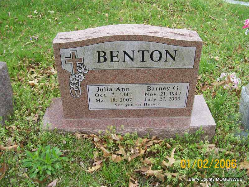 SSW: Julie Ann - Research Note: He was the son of Barney Garland Benton, Sr. and Only (Murphree) Benton. Barney was united in marriage on September 8, 1964, to Julia Tilden, who preceded him in death on March 8, 2007. Barney was President and CEO of Community Bank of the Ozarks in Sunrise Beach, Missouri. He was preceded in death by his parents; his wife Julia, and one son, Samuel. | Monett Times Phyllis Long Photo Jay Trace |