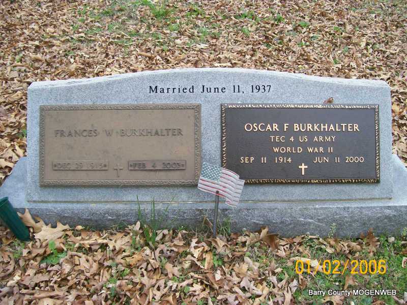 SSW: Oscar F. - Inscription: "Married June 11, 1937" - Research Note: Marionville, MO resident. She was the daughter of Alvin Ray and Elvena Carolina (Stoeker) Maddox. She had worked in Linn and Scruggs Department Store and at Sears in Decatur, Illinois. She also worked in a war plant in Iilinpolis, Illinois. She moved to Shell Knob in 1971. She married Oscar Frederick Burkhalter on June 11, 1937, in Jefferson City, and he preceded her in death June 11, 2000. She was preceded in death by one sister, Mildred Allen; and one half sister, Florence Maddox. | Monett Times Phyllis Long Photo Jay Trace |