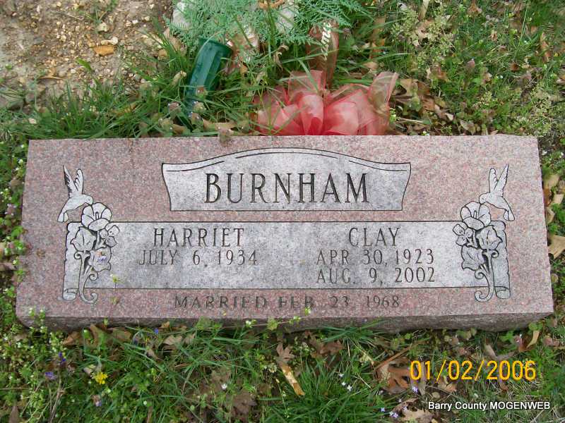 SSW: Clay - Inscription: "Married Feb. 23, 1968" - Research Note: She was the daughter of Harold and Frankie (Marion) Thurman. On February 23, 1968, she was united in marriage to Claybern Junior "Clay" Burnham, who preceded her in death on August 9, 2002. Also preceding her in death were her parents; one son, Kent Parsons; one brother, Rex Thurman and one sister, Freida Hemphill. Harriet grew up and received her education at Aurora, Missouri. She was a homemaker, living in Wichita, Kansas and Augusta, Kansas for several years. In 1970, she moved to Shell Knob to make her home. | Monett Times Phyllis Long Photo Jay Trace |