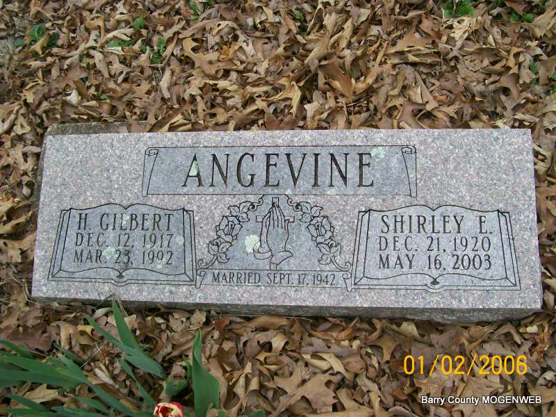 SSW: H. Gilbert - Inscription: "Married Sept. 17, 1942" - Research Note: Daughter of Clarence C. and Jessie M. (Neighbor) Anthony. She attended the University of Denver for two years. She was a medical secretary in Missouri, Arkansas, and Colorado. She moved to Shell Knob in 1986 and to Cassville in 1994. She played violin in symphonies and orchestras, sang in church choirs, and played piano and organ in churches. She was a member of Order of the Eastern Star and the First Baptist Church in Cassville, and was a foster grandparent in the Cassville schools until January of this year. She married H. Gilbert Angevine on September 17, 1942, in Denver, Colorado, and he preceded her in death March 23, 1992. She was preceded in death by one sister, Carmen Neighbor. | Monett Times May 19, 2003 Mary Homesley Photo Jay Trace |