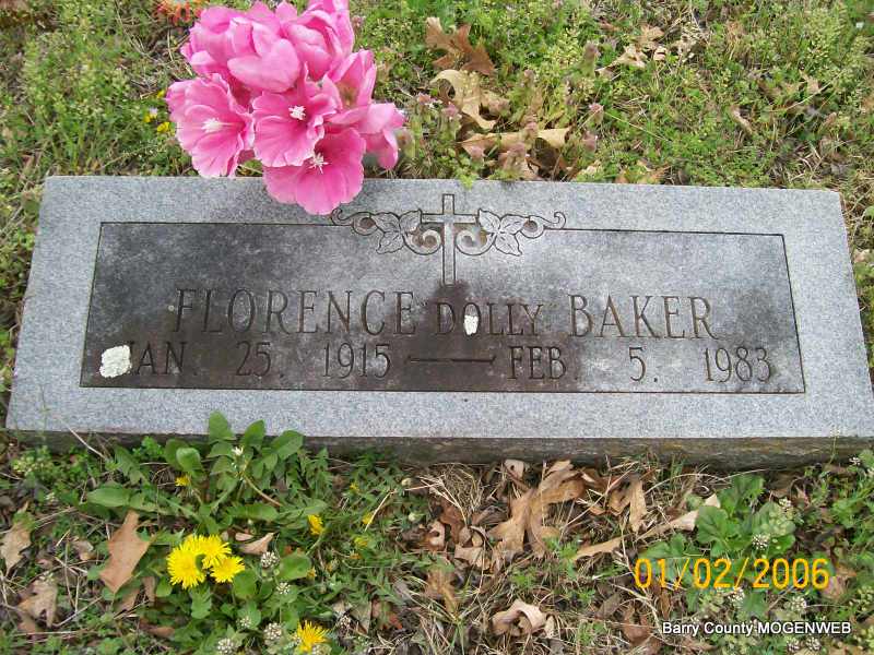 | BAKER, Florence "Dolly" (ST. JOHN) | Jan. 25, 1915 | Feb. 5, 1983 | Research Note: Florence St. John married Milton J. Baker on Jan. 22, 1931 in Neosho, Newton Co., MO. Daughter of Leroy Maxwell St. John and Josie Lee O'Banion. | Transcription Penny Cooper Bailey MO Marriage Records Census Phyllis Long Photo Jay Trace |