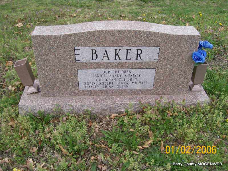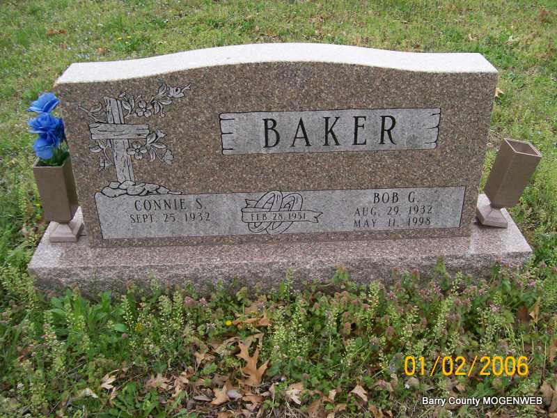 | BAKER, Bob Gene | Aug. 29, 1932 | May 11, 1998 | SSW: Connie - Inscription: "Feb. 28, 1951" - Research Note: Son of Milton J. and Florence "Dolly" Baker. - Back of Stone | Transcription Penny Cooper Bailey Census Phyllis Long Photos Jay Trace |
