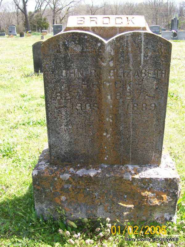 SSW: Elizabeth - Research Note: Son of John B. Brock and Elizabeth "Edna" (Lauznie) Brock and the husband of Elizabeth Horner. - Cassville Democrat, October 21, 1905 - John R. Brock, an old time and well known citizen of Shell Knob, to the older citizens, died Oct. 11, 1905, of cystitis, age 77 years, 9 months, and 27 days. He was born in Perry County, Tenn., Dec. 14, 1827, and resided there until arriving at manhood, when he married Miss Elizabeth Horner, a sister of Amos Horner, of near this place, who died in 1889 and came to Barry County in about 1850, where they resided until their deaths. To this marriage were born 12 children, 7 of whom survive their parents, who are Mrs. Wm. Painter of Rocky Comfort; Mrs. Samuel Blythe of Flat Creek, Mrs. George Snider of Cato; Mrs. Mary Painter of Goldendale, Wash.; Mrs. Samuel Winn of Waterville, Wash.; Hon. Wm. J. and John Brock of Shell Knob. He was a good citizen and enjoyed the confidence and respect of his acquaintances. | Transcription Penny Cooper Bailey Online Obit Phyllis Long Photo Jay Trace |