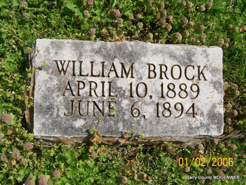 | BROCK, William | Apr. 10, 1889 | June 6, 1894 | Research Note: According to researchers, he was the son of James A. Brock and Barbara Jane Ledgerwood. | Transcription Penny Cooper Bailey Note Phyllis Long Photo Jay Trace |