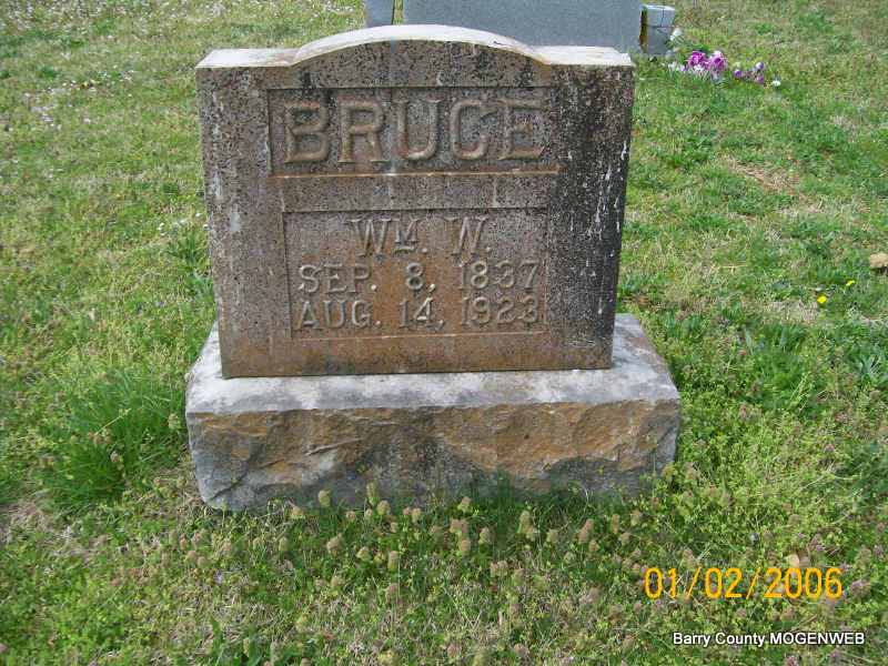 | BRUCE, William W. | Sept. 8, 1837 | Aug. 14, 1923 | Research Note: William W. Bruce married Frances M. Barracks/Barricks on Feb. 8, 1865 in Audrain Co., MO. Son of Jacob N. Bruce and Eliza Ann Smith. | Transcription Penny Cooper Bailey MO Marriage Records Census Phyllis Long Photo Jay Trace |