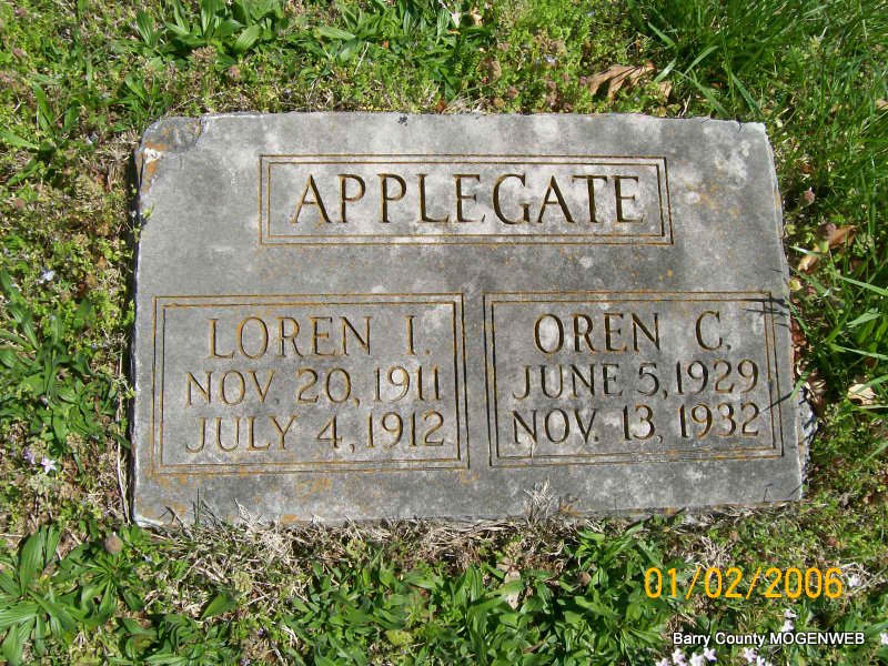 | APPLEGATE, Oren Clifton | June 5, 1929 | Nov. 13, 1932 | SSW: Loren I. - Research Note: Son of Henry and Eunice (Wills) Applegate. | Transcription Penny Cooper Bailey Census Phyllis Long Photo Jay Trace |