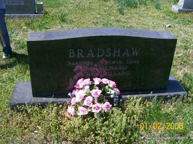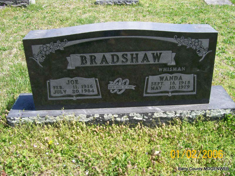 | BRADSHAW, Joe | Feb. 11, 1916 | July 20, 1984 | SSW: Wanda - Inscription: "Wed June 17, 1941" - Research Note: Husband of Wanda (Whisman) Bradshaw. Parents of twin boys Joe Richard and James Millard. - Back of Stone | Transcription Penny Cooper Bailey Photo Jay Trace |