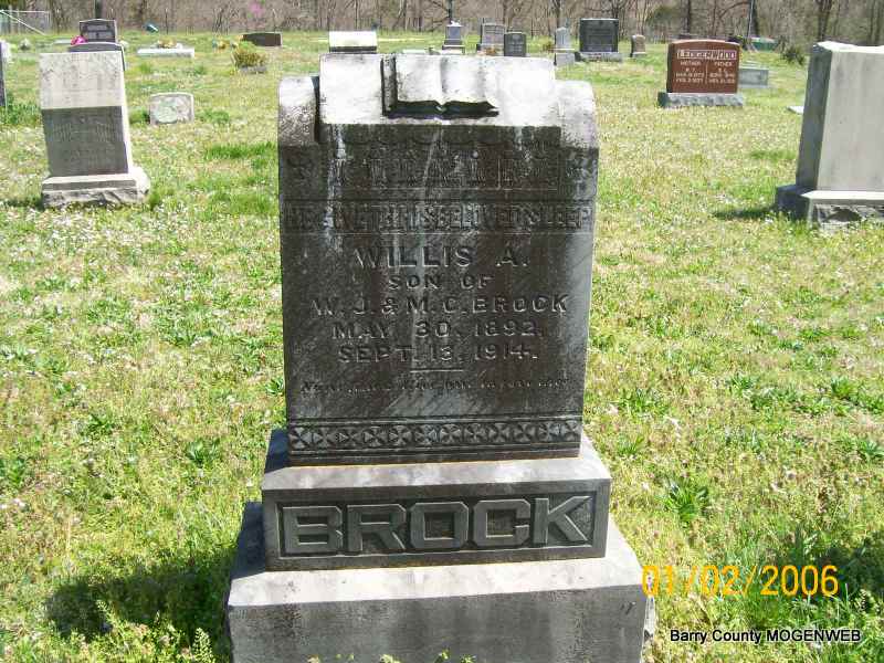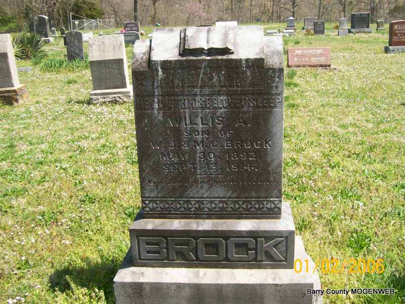 Inscription: "Son of W. J. and M. C." - Research Note: Son of William and Mary (Sanders) Brock. - September 17, 1914, Thursday, Cassville Republican, Barry Co., MO - Succumbs to Typhoid: Willis Brock, 23 years of age, son of W. J. Brock, a prominent and well known citizen of near Shell Knob, died early Sunday morning of typhoid fever. Willis, was at the time of taking sick, engaged in teaching the Fairview school near Shell Knob. His illness from the beginning became very serious and on account of his frail constitution he gradually gave way to the disease after nine days sickness. Willis was an industrious young man with an ambition to live a life of usefulness. He possessed those traits of character that would have rounded out a useful life and he had been permitted to live. Interment was made at the Painter Cemetery Sunday afternoon following short funeral services conducted at the grave by Rev. Cottrell. - June 10, 1913, Thursday, Cassville Republican - W. J. Brock and son, Willis, of Shell Knob were in Cassville Tuesday. They report the need of rain in that section of the county. - Another Photo | Transcription Penny Cooper Bailey Online Obit Donna Cooper Online Newspapers Phyllis Long Photos Jay Trace |