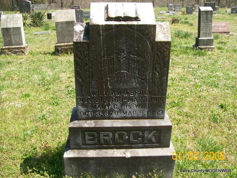 SSW: Mary C. - Research Note: Son of John R. and Elizabeth (Horner) Brock. - Cassville Republican, Mar. 9, 1916 - One of the County's Prominent Citizens Passes Away Quite Suddenly. Twice Representative in Legislature. Text Hon. Wm. J. Brock died at this home near Shell Knob on Wednesday afternoon at 5:15 o'clock, March 1, following an illness of only a few days of pneumonia. The news of the death of William J. Brock brought grief to the hearts of citizens all over the county as he for years had been recognized as a valuable citizen and enjoyed the highest esteem of everybody who knew him. Only a short time ago he spent two days in this city and appeared to be in the prime of manly vigor and robust health. He was taken on Friday of pneumonia and passed away on the Wednesday following. W. J. Brock was born near Cassville, Nov 26, 1860. He grew to manhood and had lived in this county all of his life except while out of the county attending school when a young man. He was a son of the late John Brock who was one of the pioneer citizens of the eastern part of this county. He was educated in the Cassville school and at the Clark's Academy at Berryville, Ark., for many years he had engaged in teaching and farming and was successful in any work he undertook Hew as considered on of the very strongest teachers in the county. For a few years he engaged in the mercantile business and was at the time also postmaster at Shell Knob. He build up one of the most successful country stores in the county and prospered. He sold his business about three years ago and moved back to the farm. He was twice elected to represent this county in the State Legislature, and served in the 37th and the 38th General Assemblies where he was recognized as a man of sterling worth and a faithful official. He was married to Miss Mary Sanders in 1889. To them ten children were born, nine of whom are living. They are: Mrs. Agnes Hill, Mrs. Mamie Williamson, Horace, Lester, Curtis, Russell, John, Edna and the baby son. The funeral was held Thursday afternoon, conducted by Rev. G. G. Cottrell and interment made in the Painter Cemetery. W. J. Brock was a useful citizen in whom the people of this county had utmost confidence. He was a man above the average in intellect and was an honest, open-minded, fearless, law-abiding citizen, always interested actively in the up building of the community in which he lived and the county at large. His place will be a difficult one to fill. - Donna Cooper's Note: His death certificate reads that John R. Brock, born TN, and Elizabeth Horner, born TN, were his parents. The cause of death was pneumonia. Agnes Hill, Shell Knob, MO, was the informant and burial was in Painter Cemetery on Mar. 2, 1916. - October 12, 1911, Thursday, Cassville Republican - Shell Knob News: W. J. Brock has bought a new disc wheat drill and is now ready to put his wheat in. - Cassville Republican, Thursday, Cassville, MO, Jan. 12, 1893 - Shell Knob News: Hon. W. J. Brock left for Jefferson City, where he will fight it out on his line if it takes all summer. - April 16, 1904, Cassville Democrat - Pasley News: W. J. Brock of Shell Knob has been employed as principal of the Pasley school with Mrs. Emily Skelton assistant. - November 9, 1911, Thursday, Cassville Republican - Shell Knob News: W. J. Brock and children took Thanksgiving dinner at S. W. Blythe's. - April 25, 1912, Thursday, Cassville Republican - W. J. Brock who for many years was one of the leading teachers of the county will take up teaching again, having accepted the Horner school, southeast of Cassville for the next term. He has been engaged in the mercantile business at Shell Knob for a few years and had not taught for some time until last year when he sold his store and taught his home school. - October 1, 1914, Thursday, Cassville Republican - Shell Knob News: S. W. Blythe of Cato spent part of last week at W. J. Brock's visiting the sick. He said that he had two children who have symptoms of fever. | Transcription Penny Cooper Bailey Online Obit Online Newspapers Phyllis Long Death Certificate Donna Cooper |