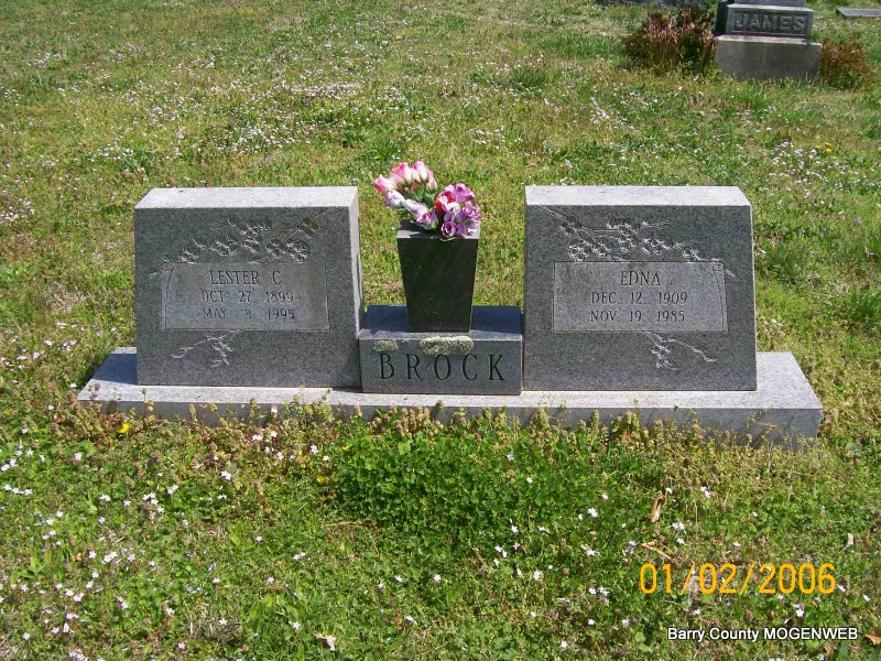 | BROCK, Lester C. | Oct. 27, 1899 | May 3, 1995 | SSW: Edna - Research Note: Edna Brock was a former teacher in Monett and was single all her life. She was born in Shell Knob and was the daughter of Mary Catherine Sanders and William Jefferson Brock. Lester Brock was her brother and in their later years they shared a house in Monett. Because both were single with few living relatives, they were buried side by side. - February 12, 1914, Thursday, Cassville Republican - W. J. Brock and son, Lester, of Shell Knob, were Cassville visitors Tuesday. | Transcription Penny Cooper Bailey Note Barbara Arnold-Feret Online Newspapers Phyllis Long Photo Jay Trace |