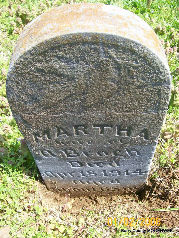 Inscription: "Wife of A. Brock - Abt. 65 Years" - Research Note: Wife of Ausney Brock married on Mar. 20, 1870 in Barry Co., MO. She was married and the daughter of Hugh L. Wilson and Maranda Clark. Born East TN. Age 66. A. A. Thurman of Shell Knob, MO was the informant. Cause of death was measles. Her husband was Ausney Levi Brock buried at Horner Cemetery. - Ausney's Obit: Cassville Republican, Mar. 6, 1913 - Mr. Ausney Brock, one of the pioneer citizens of this county and one of the county's oldest men, died at the home of his son, Rev. I. W. Brock, of a complication of troubles. Mr. Brock lacked only a few weeks of reaching his 90th birthday. He came to Barry County in 1850. He 1st married Sarah Horner. Second, on Mar. 20, 1870 he married Martha Wilson. 9 children survive him. 2 sons - Rev. I. W. Brock, at whose home he had been living for sometime, and Judge Amos Brock of Shell Knob are of the 1st marriage. The others live at a distance. During the Civil War, Mr. Brock served in the Union army. For nearly three fourths of a century he had been one of this county's highly respected citizens. He had been an invalid for the past few years but had borne his suffering patiently. In his death the county loses another of her pioneers who helped in making its early history. The funeral was conducted by Rev. Chappell with interment made at Horner Cemetery. | Transcription Penny Cooper Bailey Death Certificate MO Marriage Records Census Phyllis Long Photo Jay Trace |