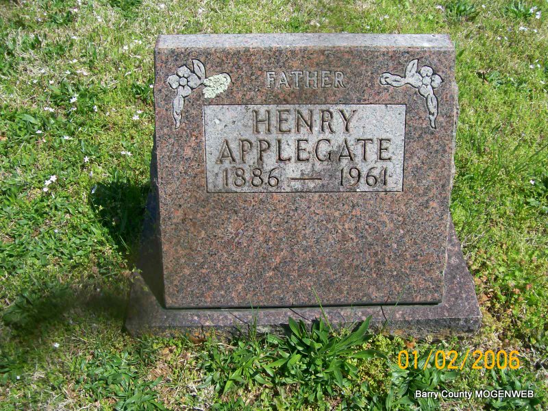 Inscription: "Father" - Research Note: Son of Joseph and Martha (James) Applegate. Husband of Eunice Wills. Donna's Note: Culver Funeral Home records state that Henry Applegate was born June 19, 1886, and that he had lived a life time in Barry Co., MO. He was widowed, age 74, and died in the Stella Hospital after suffering from a cerebral hemorrhage. His death was on April 10, 1961. His father was given as Joe Applegate and his mother as Martha James. Mrs. Dona Reding of Shell Knob, MO, was his closest relative. He was a farmer and his deceased wife's name was Eunice (Wills) Applegate. His death certificate has the Dona Reding's name spelled Dona Redding. It also reads that he lived 4 hours after the onset of his illness. - June 23, 1917, Saturday, Cassville Democrat - Shell Knob: Henry Applegate and Charley Epperly are drilling for oil on Creed Hamilton's farm. - Cassville Democrat, August 21, 1920 - Shell Knob: Henry Applegate is pulling his new thresher with his gasoline engine and it sure does the work. | Transcription Penny Cooper Bailey Culver Funeral Home, Vol. 9, Page 92, by Ted Roller Death Certificate Donna Cooper Online Newspapers Phyllis Long Photo Jay Trace |