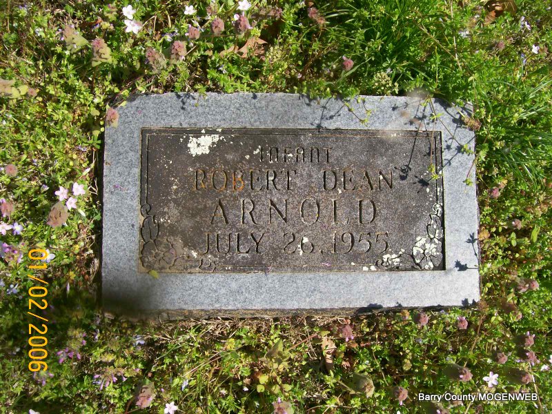 Inscription: Infant - Research Note: This date was posted as a birth date; however, Culver Funeral Home reported it was both a birth and death date. They reported that Harold Arnold was the father's name and that Vena Cooper was the mother's name of the child. Their address was given as 200 West Second, Caney, Kansas. The funeral was on July 27, 1955 and the burial in Painter Cemetery. Rev. C. F. Siler, Cassville, MO, was the minister in charge. - Robert Dean Arnold was the stillborn son of my Mom and Dad. Dad's name was erroneous known in Shell Knob for many years as Harold Arnold, but his actual name was Leslie Harold Arnold. Both Mom and Dad moved from Caney and lived in Monett Missouri until Dad passed away in 2003 and Mom in 2008. They are both buried in the IOOF Cemetery in Monett. | Transcription Penny Cooper Bailey Culver Funeral Home, Vol. 6, Page 138, by Ted Roller Donna Cooper Sister Barbara Arnold-Feret Photo Jay Trace |