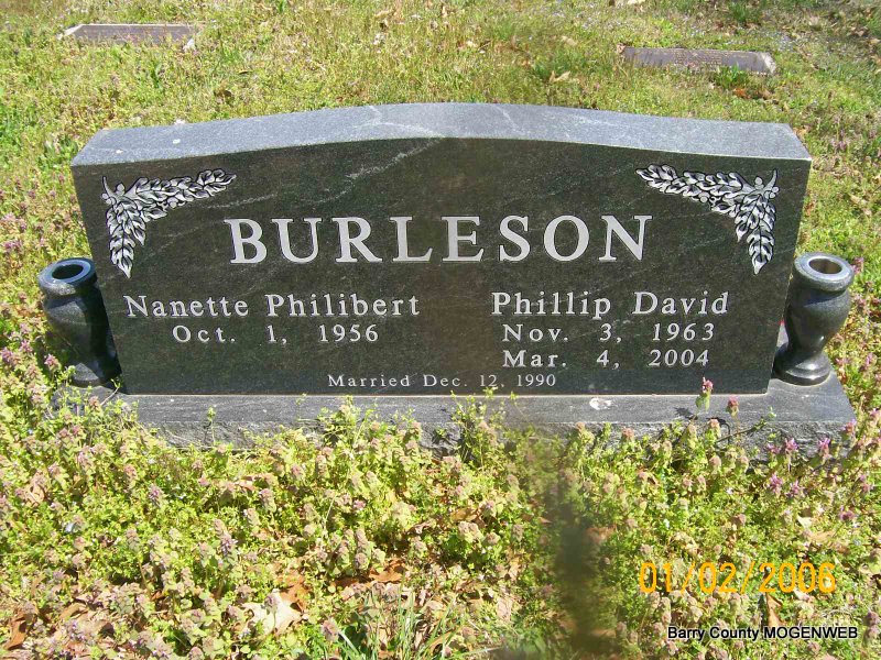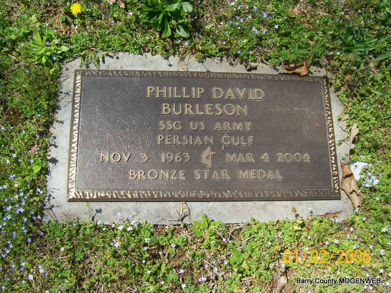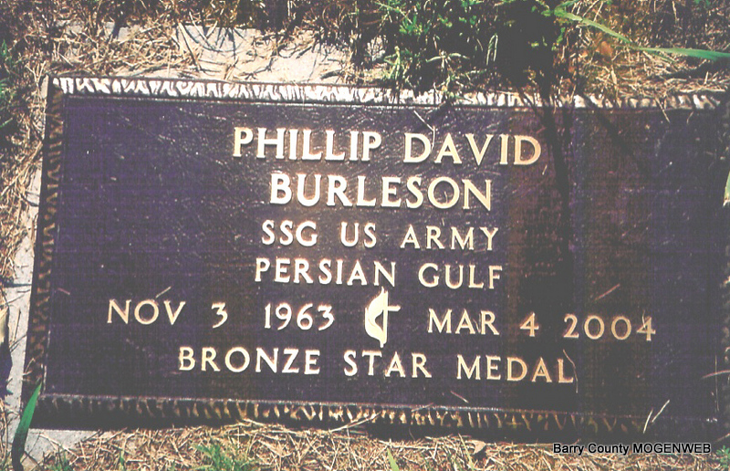 SSW: Nanette Phillibert - Inscription: "Married Dec. 12, 1990" - Research Note: Phillip D. Burleson, 40, of Shell Knob, died March 4 from injuries sustained in a traffic accident. Son of Ernest and Barbara (Brandon) Burleson. He was a telecommunication engineer in Dallas, Texas, then moved to Shell Knob in August of 2001 where he worked in telecommunications until June of 2002 when he started Daylight Donuts. He was an Eagle Scout and an Army veteran. He was a member of Central Community United Methodist Church in Shell Knob. He was a member of Veterans of Foreign Wars and was involved in the meals-on-wheels program. He married Nanette Phillibert on December 12, 1990, in Groton, Massachusetts. He was preceded in death by his grandparents. - Military Stone - Inscription: "SSG US ARMY PERSIAN GULF - BRONZE STAR METAL" - Another Photo | Note Photo Wilma Fields Monett Times Phyllis Long Photos Jay Trace |