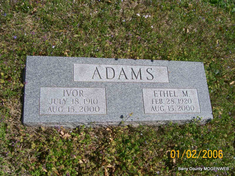 Aug. 15, 2000 | SSW: Ethel - Research Note: Ethel Adams, 80, and Ivor F. Adams, 90, both of Shell Knob, died August 15 from injuries sustained in a traffic accident. Services will be 1 p.m. tomorrow, August 19, at Williamson Chapel in Shell Knob with burial at a later date. Visitation will be from 5 to 7 p.m. today, August 18, at Williamson Funeral Home in Shell Knob. - Son of Charles T. Adams and Gertrude Malone. | Transcription Penny Cooper Bailey Monett Times Donna Cooper Census Phyllis Long Photo Jay Trace |