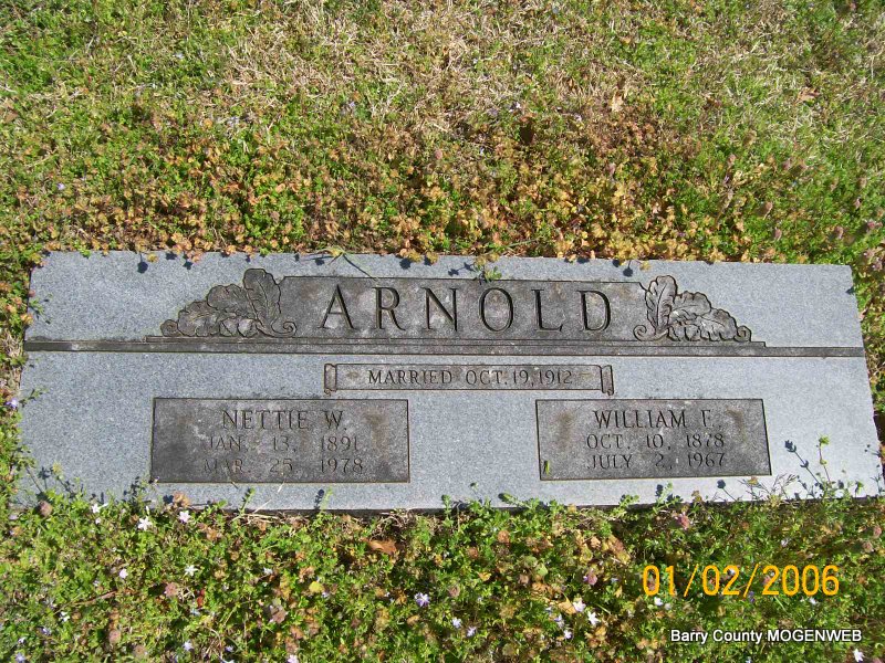 SSW: Nettie W. - Research Note: Son of James and Mary Callie (Moore) Arnold. Husband of Nettie Wills. Donna's Note: Both the stone and Culver Funeral Home have that his name was William E. Arnold, so Penny's William F. transcription is incorrect. According to Culver's his father was James Arnold and his mother was Callie Moore. Nettie Wills Arnold of Shell Knob, MO, was his closest relative. The funeral was July 5, 1967 at the Shell Knob Baptist Church with Rev. Chas. McNabb in charge. - Photo of Martha Stayton, Bill Arnold and Nettie | Transcription Penny Cooper Bailey Culver Funeral Home, Vol. 12, Page 117, by Ted Roller Donna Cooper Death Certificate Phyllis Long Photo Jay Trace |