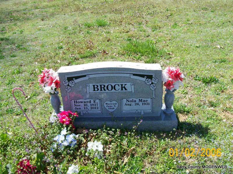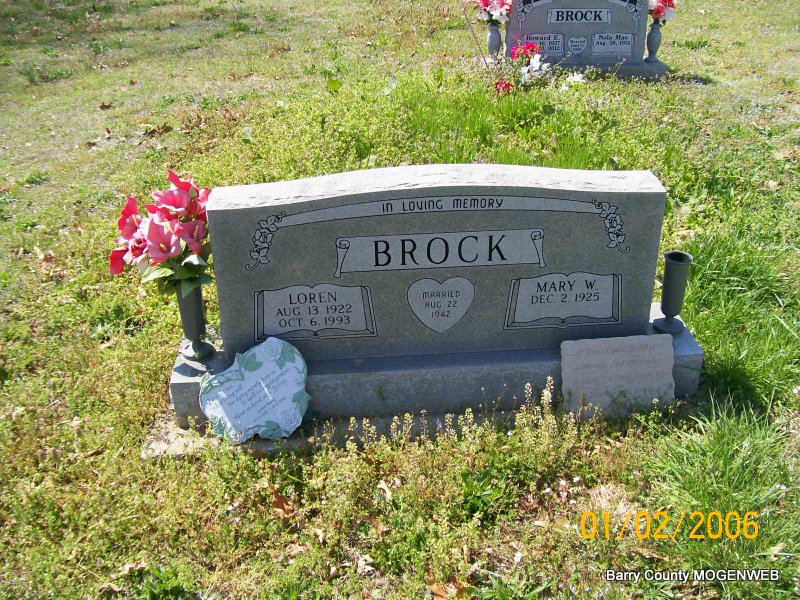 SSW: Mary Wanda - Inscription: "Aug. 22, 1942" - Military Inscription: "US ARMY WORLD WAR II" - Research Note: Son of Ernest and Jessie (Whisman) Brock. WW II Veteran serving with General Patton in the Third Army, 26th Division, and was also in the Battle of the Bulge. He moved to Cassville from Tulsa, OK, where he had worked for American Airlines as a crew chief for 24 years, retiring in 1979. He married Mary Wanda Jones on Aug. 22, 1942 in Seminole, OK. - Military Stone | Transcription Penny Cooper Bailey Williamson Funeral Home Phyllis Long Photos Jay Trace |