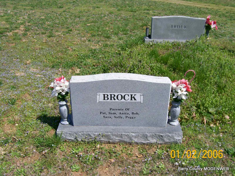 SSW: Sarah - Research Note: Son of John and Elizabeth (Horner) Brock. - Cassville Democrat, June 29, 1907 - John Brock of near Shell Knob died Wednesday morning of heart trouble, aged 40 odd years, leaving a wife and five children to mourn his death. He was a brother of Hon. Wm J. Brock of Shell Knob, and a nephew of Amos Horner of near this city. Mr. Brock was the petit jury at the February term of circuit court, and was in this city two or three weeks ago. He was a son of the late John Brock. | Transcription Penny Cooper Bailey Online Obit Phyllis Long Photo Jay Trace |