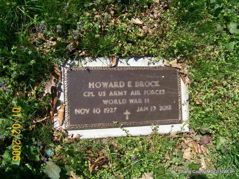SSW: Nola Mae - Inscription: "Married June 9, 1948" - Research Note: The Examiner and the Kansas City Star reported this: Howard E. Brock 84, Independence, MO. Died January 13, 2012. Visitation 9 to 11 a.m., services 11 a.m. Monday, Jan. 16, at Shell Knob Church. Funeral services were held at Shell Knob Church of Christ and burial with full Military Honors were held in Painter Cemetery on January 16, 2012. - He moved to Seminole, OK when he was 2 months old and lived in the same house until he went into the service. He went 12 years of school at Prairie View, located between Seminole and Earlsboro, Oklahoma. He always said that his family was among the lucky ones during the Depression. His father worked for an Oil Company, so they were never needy like so many families of that era. He had a talent and a love for art, but due to lack of good art supervision in his school at that time, he didn't get to pursue it as a career. He went into the service (Air Force) in 1946 and spent most of his time in Denver, Colorado and Selma, Alabama. His family moved to a little town in Missouri, Shell Knob, while he was in the service. When he received his discharge from the Air Force, he followed them there. He married Nola Mae Swofford, from Shell Knob, on June 9th, 1948. Together, they had seven children: three sons and four daughters. Education was very important to Howard, and he was very proud that all three of his sons are college graduates, with Masters Degrees. Howard attended college at Seminole Jr. College in OK; Southwest Missouri Stat in Springfield, MO; and the Kansas City Art Institute in Kansas City, MO. His first job was teaching in country schools in Barry County, Missouri (the Ozarks). Howard moved his young family to the Kansas City area in 1953 and went to work for Bendix, where he retired after 35 years. He stated, "I have not accumulated monetary wealth, but feel rich because of my family." He has seven happily married children, 14 grandchildren and 18 great-grandchildren. He was preceded in death by his father, Ernest Brock; his mother, Jessie Brock (Whisman); his brother, Loren Brock; a grandson Finian Brock; and a daughter-in-law, Carlene Brock. - Back of Stone - Military Stone - Inscription: "CPL US ARMY AIR FORCES WORLD WAR II" | Note Donna Cooper Obit Phyllis Long Photos Jay Trace |