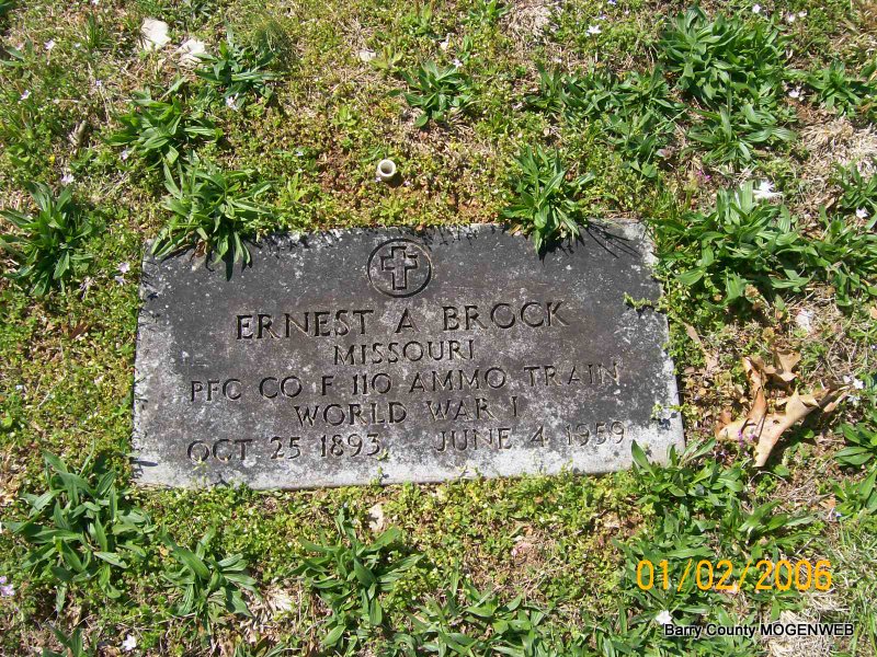SSW: Jessie - Inscription: "Married Oct. 1, 1921" - Research Note: Husband of Jessie Whisman. Son of Irvin Brock and Martha Pryor, buried at Mano Cemetery. Donna's Note: His wife was given as Jessie Brock and his parents were listed as unknown. He was disabled. Culver's Funeral Home reported that Ernest A. Brock died in the VA Hospital in Kansas City, MO, and that he was born in Mano, MO. His father was given as Irvin Brock and his mother as Martha. He died at 10:45 A.M. and was a farmer. Jessie Whisman Brock was given as his wife's name. They reported he had been in Kansas City for 3 months and that he was 65 years old. They reported the same dates as given on the death certificate. Bro. Keith Marshall of Cassville, MO, was in charge of the service. - Cassville Republican, Thursday, May 15, 1919 - Ernest Brock of Shell Knob and Chester McNabb of Exeter returned last week from service in France. They were with Frank Cox and Loren Horner in the 110th ammunition train. - Military Stone - Inscription: "MISSOURI - PFC CO F110 Ammo Train, WW I" | Transcription Penny Cooper Bailey Culver's Funeral Home, Vol. 8, Page 92, by Ted Roller Death Certificate Donna Cooper Online Newspapers Census Phyllis Long Photos Jay Trace |