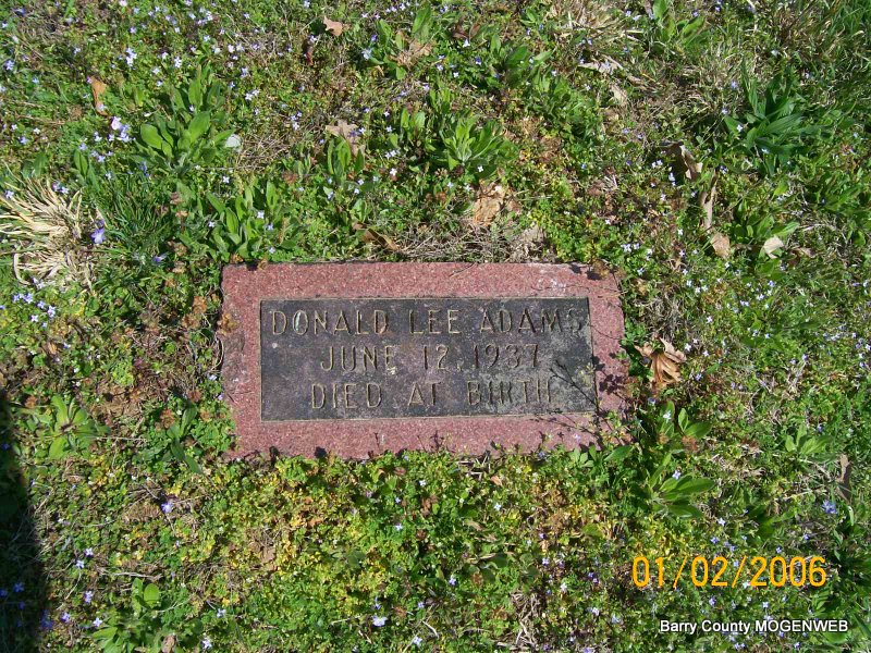 Inscription: "Died at Birth" - Research Note: His death certificate reads that her father was Doyle Adams, born Worth Co., MO, and his mother as Lora Roe, born Barry Co., MO and that he was stillborn. Grandson of Charles T. Adams and Gertrude Malone. | Transcription Penny Cooper Bailey Death Certificate Donna Cooper Photo Jay Trace |