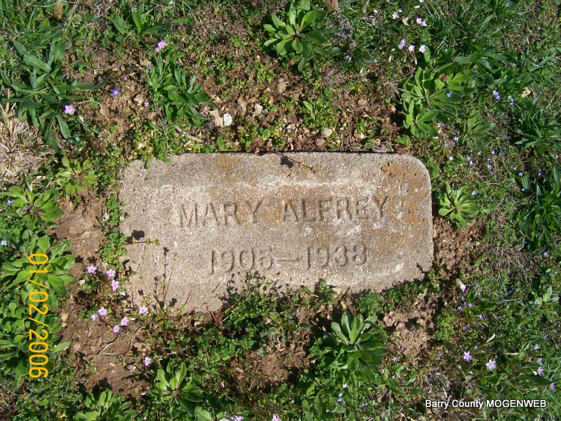 Research Note: Her death certificate reads that her father was Roe Finley and her mother was Linda Carlyle. Chester Alfrey was her husband's name. Her usual address was Shell Knob, Barry Co., MO. The cause of death was a self-inflicted gun shot wound. Gale Cope, Shell Knob, MO, was the informant. Penny posted that she was born in 1905, death certificate reads that she was born in 1902 - Mildred Roden's 1985 transcription reads that she was born in 1905 and the stone also reads 1905, which according to the death certificate is in error. | Transcription Penny Cooper Bailey Death Certificate Donna Cooper Photo Jay Trace |