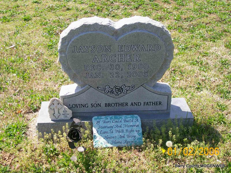 Jan. 22, 2005 | Inscription: "Loving Son, Brother and Father" - Research Note: Jan. 26, 2005, Monett Times - Jayson Edward "Jay-Bird" Archer, 24, of Shell Knob, died January 22 from injuries sustained in a traffic accident. Mr. Archer was born December 30, 1980, in Lawrence, Kansas. He worked as a carpenter and was in the heating and air conditioning business. Survivors include two daughters, of Fairview; his father, John Archer and step-mother, Michelle, of Shell Knob; his mother, Victoria (Jaimez) Archer of Eagle Rock; grandparents, David and Kathy Davis of Heavener, Oklahoma; grandmother, Iris Williams of Exeter; grandfather, Edward Jaimez of Lawrence, Kansas; grandmother, Isabelle Laymon of Wichita, Kansas; two brothers, David Greathouse of Shell Knob and Brandon Davis of Heavener, Oklahoma; four sisters, Jamie Davidson of Rocky Comfort, Angel Archer of Tulsa, Oklahoma, and Becky Greathouse and Ann Greathouse, both of Shell Knob; and several aunts and uncles. Graveside services were 2 p.m. today, January 26, at Painter Cemetery in Shell Knob under the direction of Williamson Funeral Home of Shell Knob. - Back of Stone | Obit Donna Cooper Photos Jay Trace |