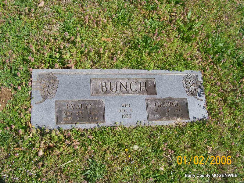 Research Note: 101 yrs. old. His wife, Evelyn Bunch, preceded him in death in 1984. Son of Jesse Bunch and Ida Viola Drury. Donna's Note: From the Monett Times - George Bunch, 101, of Tacoma, Washington, formerly of Shell Knob, died February 12. Mr. Bunch was born in Kansas. He had lived in the Shell Knob area for 55 years before moving to Tacoma, Washington, 16 months ago. He was a member of the Baptist Church in Viola. He was a retired farmer, carpenter, and school bus driver. His wife, Evelyn Bunch, preceded him in death in 1984. Survivors include one daughter, Ona Burbridge of Tacoma, Washington; one son, Gene Bunch of Merced, California; eight grandchildren and five great grandchildren. Services will be 1 p.m. Thursday, February 19, at Williamson Chapel in Shell Knob with Rev. Max Edmondson and Rev. Lawrence Shuey officiating. Burial will be in Painter Cemetery in Shell Knob under the direction of Williamson Funeral Home of Shell Knob. | Transcription Monett Times Feb. 17, 2004 Mary Homesley Obit Donna Cooper Photo Jay Trace |