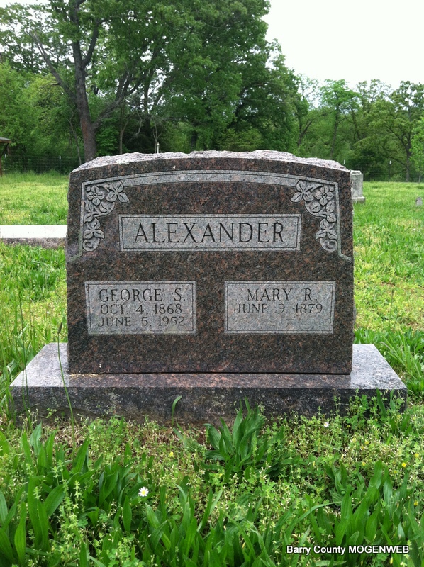 Research Note: He was a son of James H. and Fanny (Watts) Alexander. Death Certificate gives his parents as Jim Alexander born MO and Fannie Watts born Holland. Death date June 15, 1952. Also gives removal to Shell Knob, MO, Clark Cemetery. Culver Funeral Home reported that George Alexander was a son of Jim Alexander. His wife was given as Mary Rebecca Ledgerwood Alexander of Hooks, TX. Grover Alexander, Hooks Texas was his closest relative. It gives his date of birth as Oct. 4, 1867, and reads that he was age 84, 8 months and 11 days old. He had lived in the community for 3 years. It listed his death date as June 15, 1952 in Hooks, TX. His stone has June 5th as his death date. - April 18, 1908, Saturday, Cassville Democrat - Shell Knob News: Geo. Alexander of near Shell Knob, has a new son. | Transcription Penny Cooper Bailey Culver Funeral Home, Vol. 5, Page 37, by Ted Roller Donna Cooper TX Death Certificate Online Newspapers Phyllis Long Photo Jay Trace |