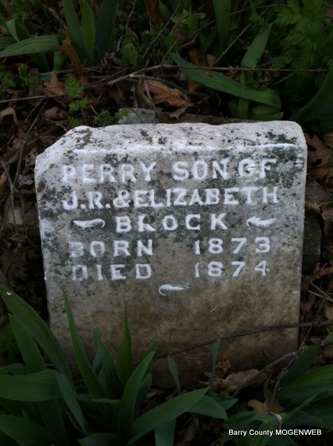| BROCK, Perry | 1873 | 1874 | Inscription: "Son of J. R. and Elizabeth" - Research Note: Son of John R. and Elizabeth (Horner) Brock. | Transcription Penny Cooper Bailey Note Phyllis Long Photo Jay Trace |