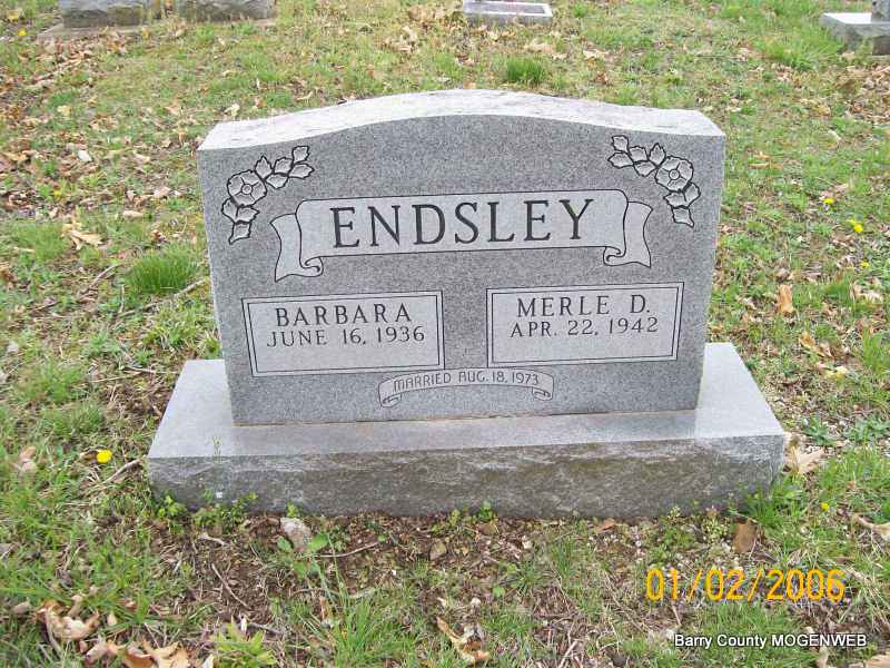| ENDSLEY, Barbara | June 16, 1936 | No Date | SSW: Merle D. - Inscription: "Married Aug. 18, 1973" | Transcription Penny Cooper Bailey Photo Jay Trace |