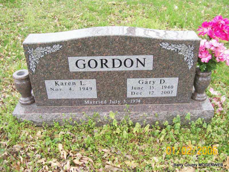 SSW: Karen L. - Inscription: "Married July 3, 1974" - Research Note: He was a resident of Shell Knob, MO, formerly of Wichita, KS, and was a son of Robert and Velma (Hosie) Gordon. In Las Vegas, Nev., on July 3, 1974, he was united in marriage to Karen Lynn Stocksen. He grew up and received his education in Salina Public Schools. Following high school, he attended Wichita State where he graduated with a Bachelor Degree in Accounting. He served his country as a First Lieutenant in the United States Army from 1963 to 1965. He was a former CPA and partner with F. B. Kubik and Company in Wichita, Kan., for many years. - He first married Caroline D. Mason. She died in 1973 in Wichita, KS. | Barry Co. Advertiser Phyllis Long Photo Jay Trace |