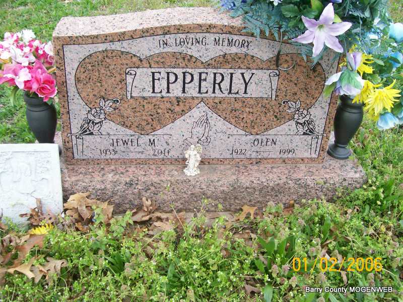 SSW: Olen - Research Note: She was the daughter of Alvin and Francis E. (Starkey) Henson. On July 20, 1952, in Eureka Springs, Arkansas, she was united in marriage to Olen Epperly, who preceded her in death on March 19, 1999. Also preceding her in death were her parents; one sister, Marilyn Huffman in 1982; six half-brothers, Jim Starkey, Albert Talbert, Charles Talbert, Lorne Henson, Glen Henson, Calvin Henson; one half-sister, Marcella Gordon and a great granddaughter, Summer. Jewel grew up and received her elementary education at the Gaddis School near Shell Knob and then went to Cassville High School, graduating with the Class of 1951. After graduating she moved to Los Angeles, California, working there one year and then she returned to Shell Knob to make her home. Most of her life was spent helping Olen on the farm. She also had been employed at Jumping Jack Shoe Factory, Shell Knob Elementary School as a cook and Rima's Supermarket. In 1998, she and Olen retired and moved to Cassville. - Back of Stone | Transcription Penny Cooper Bailey Fohn Funeral Home Phyllis Long Photos Jay Trace |