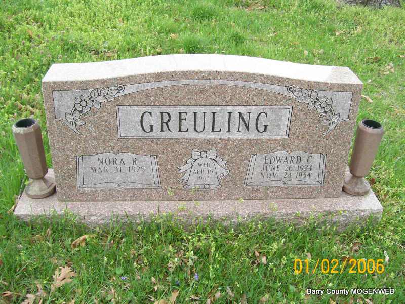 SSW: Edward - Inscription: "Wed. Apr. 19, 1947" - Research Note: She was a daughter of Phillip and Agnes (Lennon) Ryan. She was united in marriage to Edward Charles Greuling, who preceded her in death in November 1984. She received her education in Long Island, N. Y., where she graduated from high school. In 1979 she moved to Shell Knob to make her home. - Edward C. Greuling married Nora A. Ryan on Mar. 28, 1947 in Queens, New York City, New York. | Transcription Penny Cooper Bailey Cassville Democrat NY Marriage Records Online Obit Phyllis Long Photo Jay Trace |