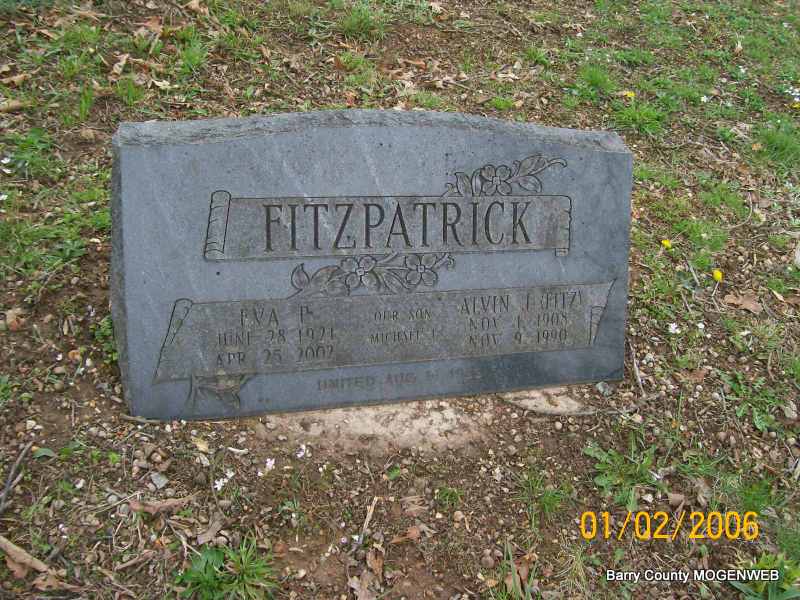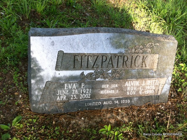 SSW: Alvin J. "Fritz" - Inscription: "Our Son - Michael J." - "United 14, Aug. 1953" - Research Note: Eva Pearl Fitzpatrick, 80, of Shell Knob, died April 25 at Cox Medical Center South in Springfield. Mrs. Fitzpatrick was a resort owner/operator. Survivors include one son, Mike Fitzpatrick of Shell Knob; one step-son, name and address unavailable; one step-daughter, name and address unavailable; two brothers, names and addresses unavailable; one sister, name and address unavailable; and three grandchildren. Graveside services were 4 p.m. yesterday, April 28, at Painter Cemetery in Shell Knob with Rev. John Duncan officiating under the direction of Williamson Funeral Home of Shell Knob. - Another Obit: She was born to Leonard T. and Pearl (Bogar) Alkire. She received her education in Odessa, Mo., where she graduated from high school and then attended two years of college. On Aug. 14, 1953, in Des Moines, Iowa, she married Alvin Joseph Fitzpatrick. After their marriage, she and her husband lived in Kansas City, Mo., where they started their family. In 1968, they moved to Shell Knob. They owned and operated Fitz's Fish N Fun Resort, retiring at the end of 1976. She was a member of Country Club Christian Church in Kansas City, and attended Central Community United Methodist Church in Shell Knob. She was also a member of Central Crossing Association Ladies' Auxiliary and was active in getting the community building built. She was preceded in death by her husband on Nov. 9, 1990. She was also preceded in death by her parents. Survivors include a son and daughter-in-law, a stepson, a stepdaughter, 3 grandchildren, 2 brothers, and a sister. - Another Photo | Transcription Penny Cooper Bailey Monett Times Apr. 29, 2002 Mary Homesley Obit Phyllis Long Photos Jay Trace |