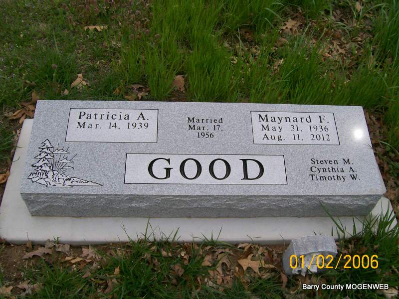 SSW: Maynard F. - Inscription: "Mar. 17, 1956" - Research Note: Daughter of Neal and Florence (Richardson) Sloan. Pat grew up and received her education in Louisburg, Kansas. On Mar. 17, 1956, she was united in marriage to Maynard Good who preceded her in death. She was a home maker and helped with family businesses and had many jobs throughout her life. In 1989, after living in various places, they moved to Shell Knob to retire and make a home. She was a member of Shrine Ladies and enjoyed her pets and visiting with friends on the phone. She was a wonderful wife and mother, a loving grandma, cherished sister and loyal friend. We celebrate her life and accomplishments and will cherish her memory for the rest of our lives. Pat is survived by two sons; a daughter; nine grandchildren; eighteen great-grandchildren; one sister; one niece; several nephews; and other relatives and many friends. | Shell Knob Funeral Home L. Pearce Findagrave Photo Jay Trace |