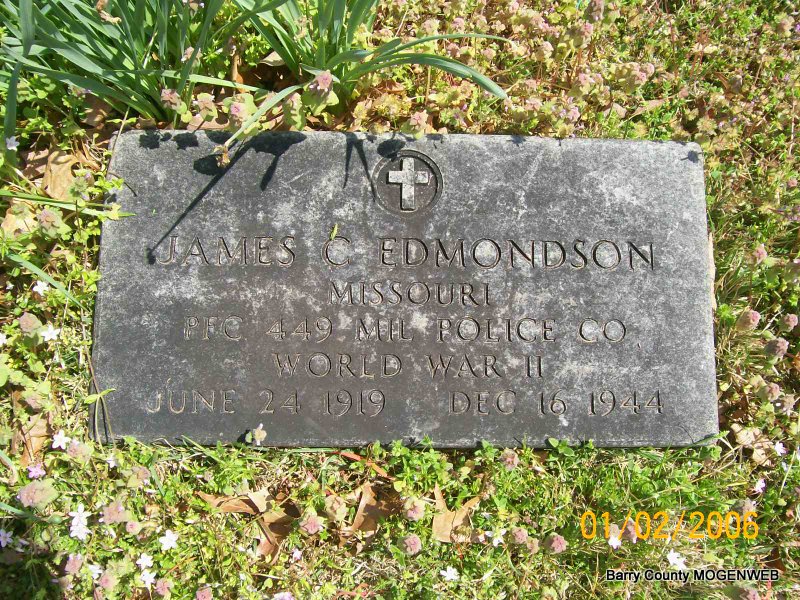 Inscription: "Missouri PFC 449 Mil Police Co. WW II" - Research Note: Daughter of William Edmondson, born Berryville, AR, and Bessie James born near Shell Knob, MO. | Transcription Penny Cooper Bailey Census Phyllis Long Photo Jay Trace |
