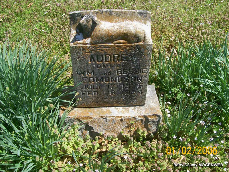 | EDMONDSON, Ella Mae | Feb. 17, 1932 | Aug. 13, 1933 | Inscription: "Dau. of Wm. and Bessie" - Research Note: Daughter of William Edmondson, born Berryville, AR, and that her mother was Bessie James born near Shell Knob, MO. | Transcription Penny Cooper Bailey Note Phyllis Long Photo Jay Trace |