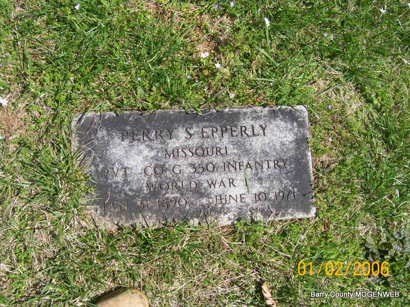 SSW: Flossie C. - Research Note: Son of Perry Wilson and Mary Ellen (Wilcox) Epperly. Husband of Flossie Painter. Flossie was the informant on the death certificate. WI MO Pvt. C. G. Infantry. Donna's Note: Culver Funeral Home reported that Perry Sherman Epperly was married to Flossie Painter Epperly. His father was Perry W. Epperly and his mother was Mary Ellen Wilcox. His address was Shell Knob, MO and he was a retired farmer who died at home. He was born in Shell Knob and had lived there all his life. The funeral was at the Culver Chapel, and Cline Hancock was the minister in charge of the funeral. Burial was June 13, 1971 in Painter Cemetery. - June 27, 1903, Saturday, Cassville Democrat - Shell Knob News Items: Perry Epperly's son, Sherman, who was kicked by a horse and hurt quite badly two weeks ago, is again able to be out. - Military Stone - Inscription: "PERRY S. EPPERLY - MISSOURI - PVT CO. G 350 INFANTRY - WORLD WAR I " | Transcription Penny Cooper Bailey Culver Funeral Home, Vol. 14, P. 83, by Ted Roller Donna Cooper Online Newspapers Census Death Certificate Phyllis Long Photos Jay Trace |