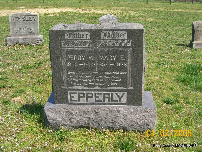 | EPPERLY, Mary Ellen "Polly" (WILCOX) | 1854 | 1938 | SSW: Perry W. - Research Note: Daughter of William L. Wilcox and Susan Mariah Brockman. Perry W. Epperly married Mary E. Wilcox on Dec. 28, 1875 in Stone Co., MO. - Cassville Republican, August 3, 1893 - Shell Knob News: Mrs. Perry Epperly was taken to Dr. Petty's on Rock House for treatment last week and we learn that she is dangerously ill at present, but hope that the worst is past and that she may soon return to her family in better health. - February 24, 1916, Thursday, Cassville Republican - Shell Knob News: Mary E. Epperly has been visiting her daughter, Mrs. Susie Goodwin between this place and Berryville School. | Transcription Penny Cooper Bailey Census Online Newspapers MO Marriage Records Phyllis Long Photo Jay Trace |