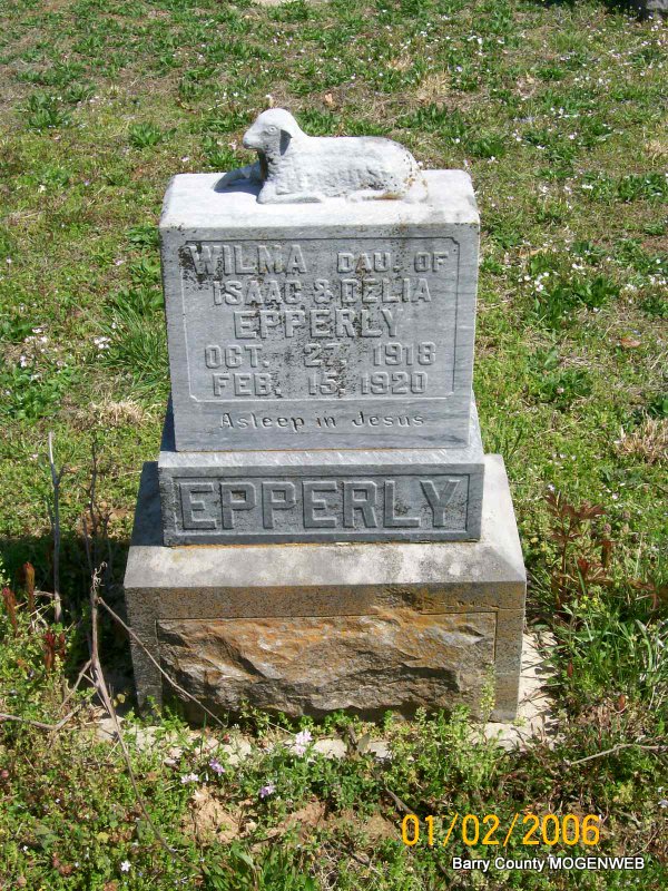 | EPPERLY, Wilma | Oct. 27, 1918 | Feb. 15, 1920 | Inscription: "Dau. of Isaac and Delia Epperly" - Research Note: Daughter of Isaac and Martha Cordelia "Delia" (Blythe) Epperly, buried at Epperly Memorial Cemetery. | Transcription Penny Cooper Bailey Census Phyllis Long Photo Jay Trace |