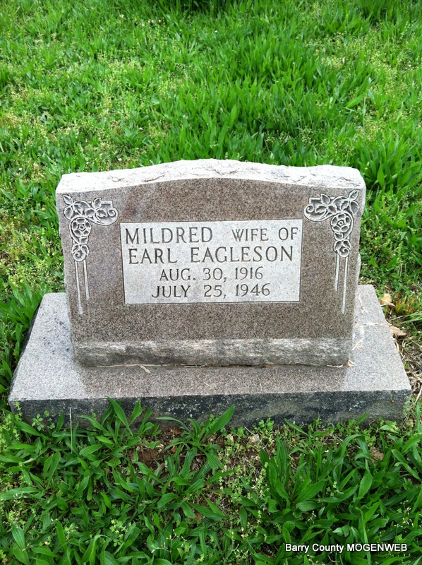 | EAGLESON, Mildred (LEDGERWOOD) | Aug. 30, 1916 | July 25, 1946 | Inscription: "Wife of Earl Eagleson" - Research Note: Daughter of Grover and Lizzie (Mikeman) Ledgerwood. | Transcription Penny Cooper Bailey Census Phyllis Long Photo Jay Trace |