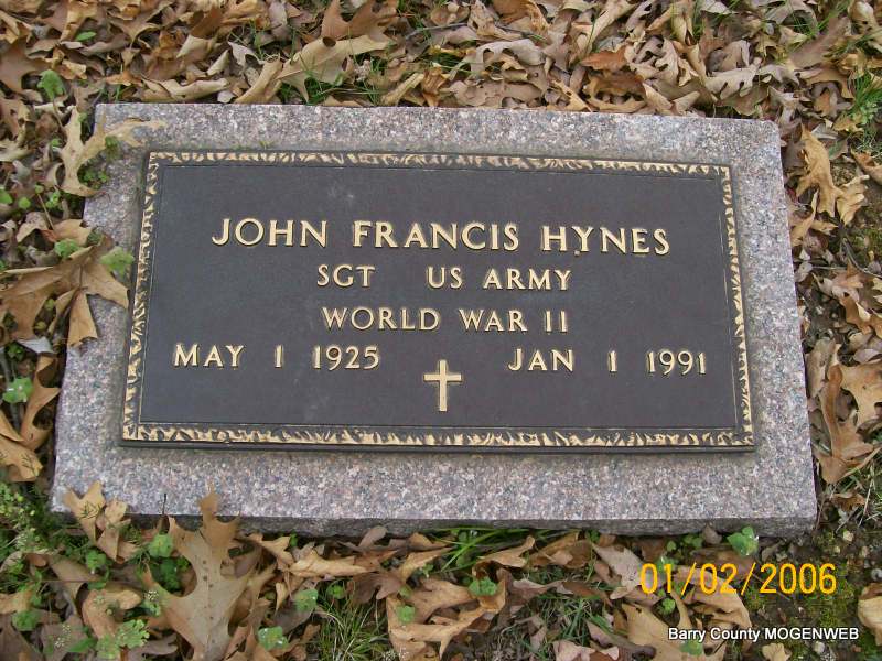 Jan. 1, 1991 | Inscription: "SGT US ARMY WORLD WAR II" - Research Note: Son of Richard L. Hynes and Fanny Brown. Possible married records: John F. Hynes, age 26, married Rose Marie Lowther, age 20, on Jan. 20, 1951 in Oklahoma City, Oklahoma. | Transcription Penny Cooper Bailey OK Marriage Records SS Claims Index Phyllis Long Photo Jay Trace |
