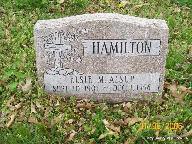 | HAMILTON, Elsie M. (HALE) (ALSUP) | Sept. 10, 1901 | Dec. 1, 1996 | Research Note: She was the granddaughter of James Monroe Hale and Margaret Jane Eveline Green. Living with them in the 1910 and 1920 census. Elsie M. Hale, age 20, married Lewis Elmer Alsup, age 34, on Mar. 18, 1922 in Howell Co., MO. Elsie M. Alsup, age 48, married Rollie Oscar Hamilton, age 53, on June 10, 1950 in Jackson Co., MO. | Census MO Marriage Records Phyllis Long Photo Jay Trace |