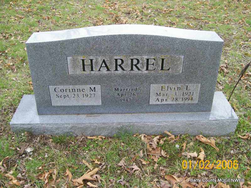 SSW: Elvin L. - Inscription: "Married April 26, 1947" - Research Note: She was the daughter of David and Marie Owston. On April 26, 1947, she married Elvin Lee Harrel. He preceded her in death on April 24, 1994. Corinne worked as a telephone operator for Southwestern Bell in Pratt, baked and decorated hundreds of wedding and birthday cakes in her home and worked as a florist for Ackley Florist in Pratt. Known as "Corky," she was an active Girl Scout leader for decades in Pratt. She was a member of Our Savior Lutheran Church at Pratt, Peace Lutheran at Shell Knob, Mo. and Holy Cross Lutheran in Wichita. Corinne was proceeded in death by her parents; her husband Elvin, brother Roy Owston, sisters Rowena Wines and Olive Morgison, and niece Anna Marie Wines Bennett. Corinne has been cremated and interment will take place next to her husband at Painter Cemetery at Shell Knob, MO. | Transcription Penny Cooper Bailey Photo Jay Trace |