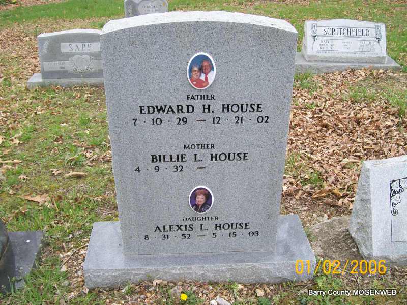 SSW: Billie L. and Alexis L. - Inscription: "Father" - Research Note: He was the son of George F. and Florence A. (Hawkins) House. Mr. House was a veteran, having served his country with the United States Air Force during World War II. From 1958 until 1968, he was a deputy and a police officer in Missouri, serving with the Greene County Sheriff's Department, the Christian County Sheriff's Department, and the Springfield Police Department. He and his family then moved to California. He retired to Shell Knob in 1987. Mr. House was a member of the Church of Jesus Christ of Latter-day Saints in Berryville and in Cassville, Mo., for many years. He was preceded in death by his parents, and by 10 brothers and sisters. | Obit SS Claims Index Phyllis Long Photo Jay Trace |