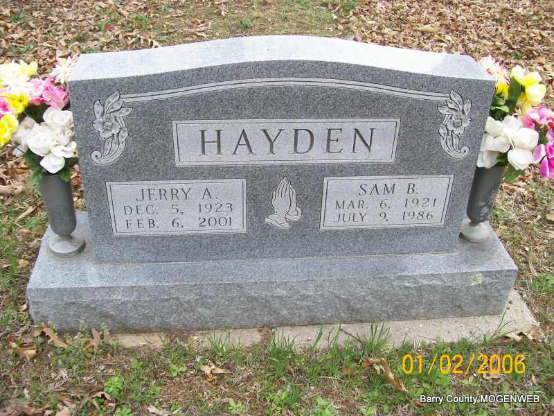 SSW: Sam B. - Research Note: Obit - Jerry Ann Hayden, 77, of Shell Knob, died February 6 at her daughter's home in Shell Knob. Mrs. Hayden was born December 5, 1923, in Wichita, Kansas, the daughter of Clarence M. "Jim" and Gladys M. (Hoag) Morrison. She was a graduate of Topeka High School in Topeka, Kansas, and moved to Shell Knob in 1976. She and her husband operated Hayden Real Estate in Shell Knob. She was a member of S.O.L.O., the Shell Knob Bridge Club, and Trinity Presbyterian Church in Shell Knob. She married Sam B. Hayden on August 6, 1942, in Galveston, Texas, and he preceded her in death July 9, 1986. She was preceded in death by one brother, Sam Morrison; and one sister, Sydney Schmolze. Services will be 10:30 a.m. tomorrow, February 9, at Trinity Presbyterian Church in Shell Knob with Rev. Denzel Nonhof officiating. Burial will be in Painter Cemetery in Shell Knob under the direction of Williamson Funeral Home of Shell Knob. Visitation will be from 6 to 8 p.m. today, February 8, at the funeral home. Memorials may be made to the church building fund, Carroll Regional Hospice, or the American Cancer Society. | Transcription Penny Cooper Bailey Photo Jay Trace Monett Times Donna Cooper |