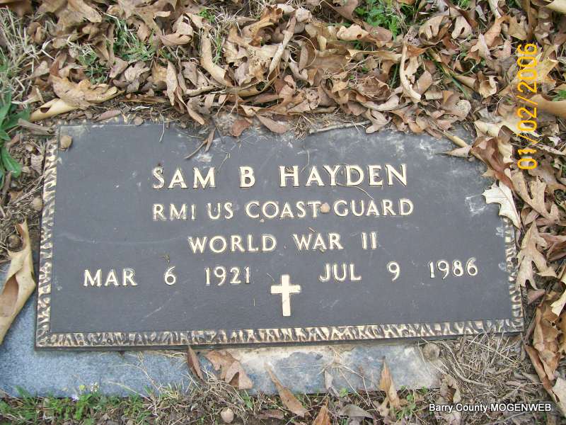 July 9, 1986 | SSW: Jerry Ann - Research Note: Son of David Riddle Hayden and Myrtle Evelyn Brown. - Military Stone - Inscription: "RMI US COAST GUARD - WORLD WAR II" | Transcription Penny Cooper Bailey Census Phyllis Long Photos Jay Trace |